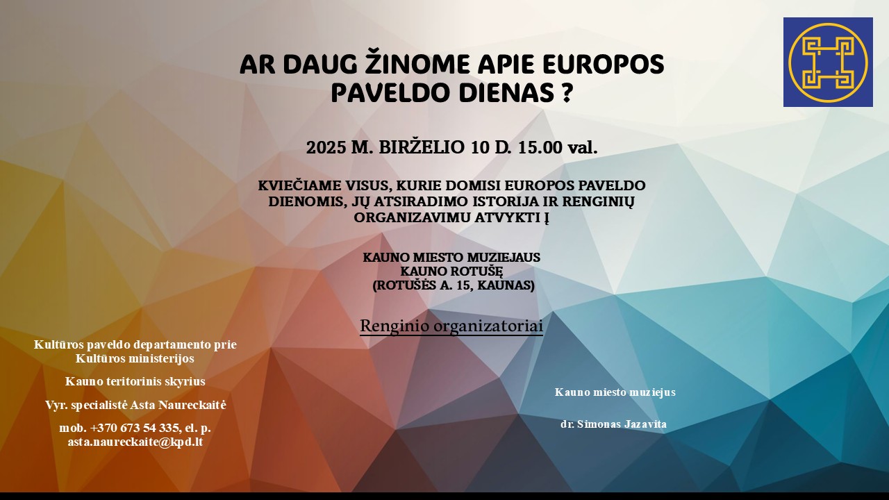 Kultūros paveldo departamento prie LR Kultūros ministerijos Kauno teritorinis skyrius birželio 10 d. kviečia į renginį „Ar daug žinome apie Europos paveldo dienas?“