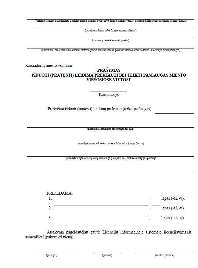 Užpildytą ir pasirašytą prašymą, gaminių nuotraukas bei prekybos vietos vizualizaciją iki gegužės 8 d. prašome pateikti Kaišiadorių miesto seniūnijai: