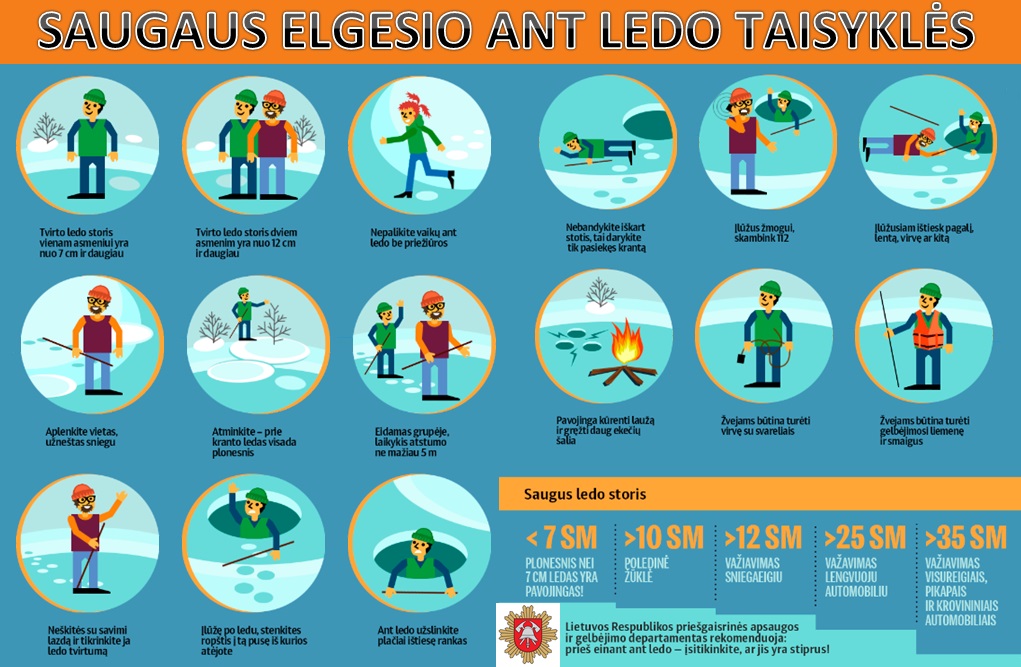 Einant ledu reikia turėti tvirtą lazdą ir ja tikrinti ledo stiprumą. Jeigu į ledą sudavus lazda, ant jo pasirodo vanduo, reikia nedelsiant grįžti į krantą. Eiti reikia čiuožiant, neatitraukiant kojų nuo ledo. Jeigu esate su slidėmis, tai atsisekite slidžių tvirtinimus, kad esant reikalui jas greitai galima būtų nusimesti nuo kojų. Slidžių lazdas laikykite rankose, plaštakų neprakiškite pro kilpas. Galėsite lazdas greitai numesti. Jeigu ledu eina grupė žmonių, reikia laikytis distancijos. Atstumas tarp žmonių turi būti ne mažesnis kaip 5 metrai. Einant ledu reikia aplenkti vietas, kurios užneštos sniegu arba pripustytos pusnių, nes po sniegu ledas visada yra plonesnis. Ypač atsargiems reikia būti prie kranto, nes čia ledas silpnesnis ir jame gali būti įtrūkimų. Ledas labai pavojingas ir atodrėkių metu. Ant ledo ypač mėgsta žaisti vaikai, nepalikite jų be priežiūros.