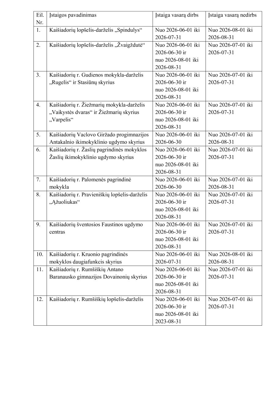 Kaišiadorių rajono savivaldybės švietimo įstaigų, vykdančių ikimokyklinio ir priešmokyklinio ugdymo programas, grupių darbo 2026 m. vasaros laikotarpiu grafikas