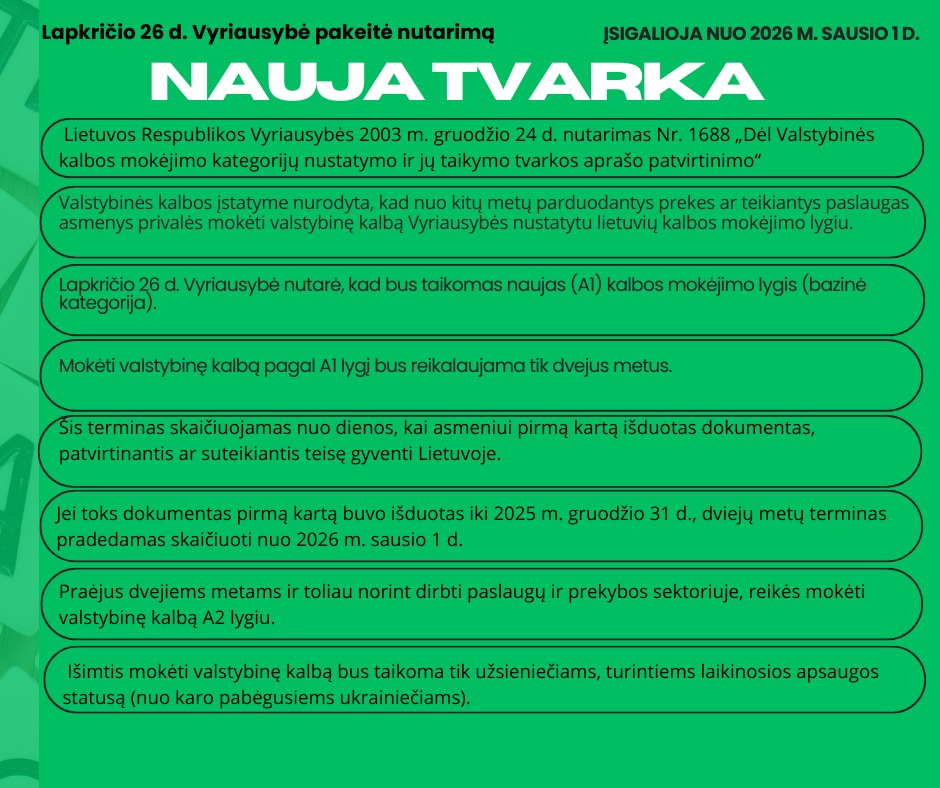 ✅2025 m. lapkričio 26 d. Vyriausybė nutarė, kad bus taikomas naujas (A1) kalbos mokėjimo lygis (bazinė kategorija).