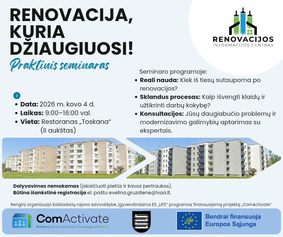 2026 m. kovo 4 d. Kaišiadoryse vyks praktinis seminaras „Renovacija, kuria džiaugiuosi!“, skirtas daugiabučių namų gyventojams ir bendrijų atstovams.
