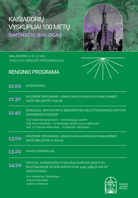 Balandžio 4 d. sukanka lygiai 100 metų nuo dienos, kai buvo įsteigta Kaišiadorių vyskupija. 1926 m. balandžio 4 d. priimtas sprendimas tapo pradžia istorijai, kuri šiandien matuojama ne tik metais, bet ir kultūros raiška, bendruomeniniais ryšiais, nepalaužiamomis asmenybių istorijomis. Kelsime klausimą, kas iš tikrųjų išliko per šimtą metų ir kas vis dar mus jungia šiandien.
