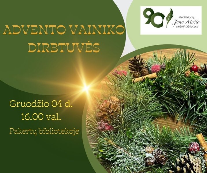 Kviečiame į Advento vainikų dirbtuves. Jų gamybai naudosime natūralias gamtines priemones, įvairias dekoracijas, džiovintus augalus.