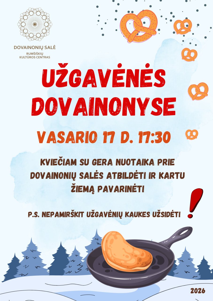 Visus, didelius ir mažus, ratuotus ir pėsčius, kaimynus ir svečius kviečiame į Užgavėnių šventę Dovainonyse! Visi kartu daug šoksim ir trepsėsim, kad užtikrintai žiemą išvytumėm! Nepamirškite Užgavėnių kaukių užsidėti, nes baisiai gražios kaukės konkurse reiks dalyvauti!