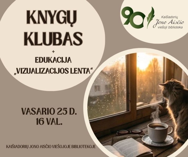 Vasario 25 d., 16 val. kviečiame į Knygų klubo susitikimą ir edukaciją „Vizualizacijos lenta“, kurios metu aptarsime išsirinktą knygą ir dalyvausime kūrybinėje edukacijoje, skirtoje savęs pažinimo, pasitikėjimo savimi ir kūrybiškumo stiprinimui. Pasitelkiant vaizdines priemones bus kuriama asmeninė vizualizacijos lenta, padėsianti formuoti asmeninės ateities vizijas ir geriau įsiklausyti į savo vidinius poreikius. Kviečiame prisijungti visus, norinčius prasmingai praleisti laiką, pasidalinti įžvalgomis ir kurti įkvepiančią aplinką.