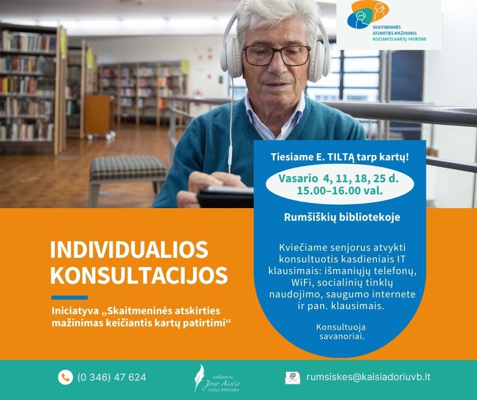 Konsultacijos skirtos didinti jaunimo ir senjorų bendravimą, padedantį tobulinti skaitmeninį raštingumą, mažinti kartų atskirtį.