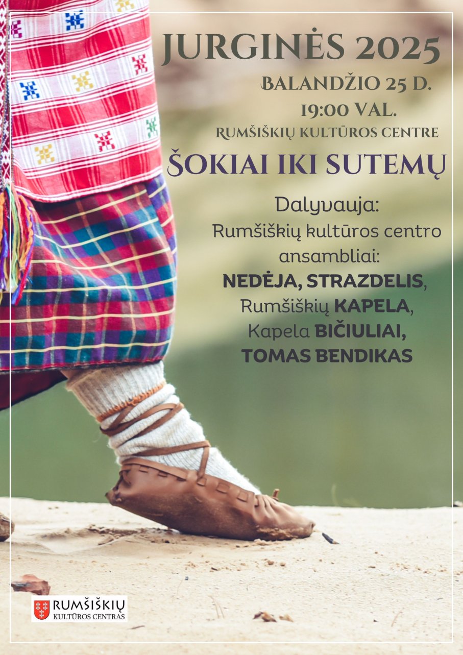 Tradiciškai, šoksime iki paryčių Jurginių šventėje, kurią organizuoja Rumšiškių kultųros centro folkloro ansamblis „Nedėja“, dalinsimės duona, dainuosime dainas, šoksime ratelius. Svečiuose kapela „Bičiuliai“, vakaro metu muzikuos ir Rumšiškių kultūros centro kolektyvai – kapela „Rumškės“ bei vaikų folkloro ansamblis „Strazdelis“.
