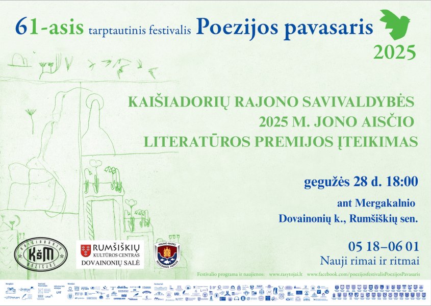 Gegužės 28 d., 18 val. Poezijos pavasario ir Kaišiadorių rajono saivaldybės Jono Aisčio literatūros premijos įteikimo renginys vyks ant Mergakalnio, Dovainonių k., Rumšiškių sen. Kviečiame gamtos apsuptyje pasiklausyti poezijos ir muzikos garsų ir prisiminti poetą Joną Aistį.