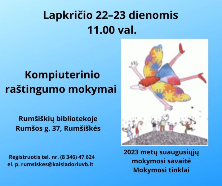 2023 metų suaugusiųjų mokymosi savaitės „Mokymosi tinklai“ metu bus organizuojami mokymai, skirti pradedantiesiems vartotojams norintiems išmokti naudotis kompiuteriu: rengti tekstinius dokumentus, saugiai naršyti internete bei rasti aktualios informacijos, dalintis informacija bei bendrauti internetu su artimaisiais ir draugais.