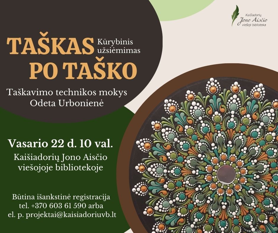 Menas – tai žmogaus kūrybos ir išraiškos forma, atspindinti mūsų jausmus, mintis, idėjas ir pasaulį. Taškavimo procesas labai įdomus, nes rezultatas skatina smalsumą. Taškavimo technikos mokys Odeta Urbonienė.