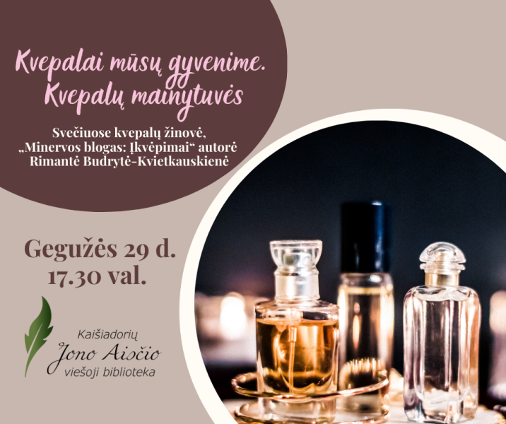 Kviečiame praleisti jaukų moterišką vakarą kvapų apsuptyje. Kalbėsime apie kvepalų istoriją, kvapus ir kvepalus literatūroje, nagrinėsime kvepalų pavyzdžius.