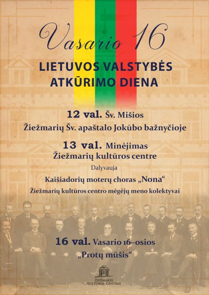 Lietuvos valstybės atkūrimo dienai skirtas minėjimas. Dalyvauja Kaišiadorių moterų choras „Nona“, vadovė Jurgita Jašauskienė ir Žiežmarių kultūros centro mėgėjų meno kolektyvai.