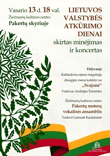 Lietuvos valstybės atkūrimo dienos minėjimas, koncertas. Dalyvauja Kaišiadorių rajono neįgaliųjų draugijos meno kolektyvas „Svajonė ", vadovas Andrejus Tomenko ir Žiežmarių kultūros centro Pakertų moterų vokalinis ansamblis, vadovė Laimutė Kaulakienė.