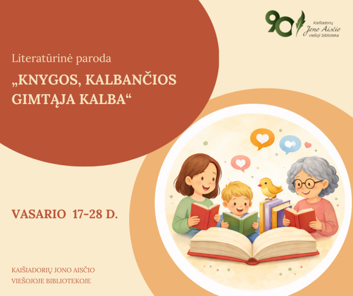 Vasario 17–28 d. kviečiame vaikus ir jaunimą apsilankyti literatūrinėje parodoje „Knygos, kalbančios gimtąja kalba“, skirtoje Tarptautinei gimtosios kalbos dienai paminėti. Parodoje pristatomos lietuvių autorių knygos, parašytos gimtąja kalba, atveriančios spalvingus pasaulius, supažindinančios su įdomiais herojais ir padedančios augti, mąstyti, jausti bei lavinti vaizduotę. Parodos tikslas – atskleisti, kokia gyva, turtinga ir įdomi yra lietuvių kalba knygų puslapiuose, skatinti jaunuosius skaitytojus rinktis lietuvių autorių kūrinius ir didžiuotis savo gimtąja kalba. Kviečiame atrasti istorijas, kurios įkvepia, sušildo ir leidžia pajusti, kad gimtoji kalba – tai raktas į savą, artimą ir prasmingą pasaulį.