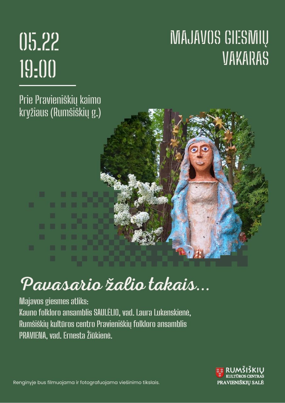 Puoselėjant senąsias Pravieniškių kaimo gegužinių pamaldų, skirtų Švč. Mergelės Marijos pagerbimui, vadinamų „majavomis“ tradicijas, Rumšiškių kultūros centro Pravieniškių folkloro ansamblis „Praviena“ (vad. Ernesta Žiūkienė) kviečia į giesmių vakarą „Pavasario žalio takais...“ prie skulptūros „Angelas Sargas“ (Rumšiškių g.) gegužės 22 d. 19 val. Dalyvaus folkloro ansamblis iš Kauno „Saulėlio“ (vad. Laura Lukenskienė).