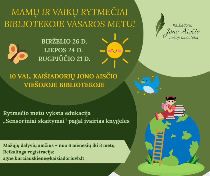 Edukacija „Sensoriniai skaitymai“ pagal įvairias knygeles. Žaismingas eiliuotas tekstas ir kontrastingos iliustracijos patrauks vaiko dėmesį ir plės žodyną. Knyga padės vaikui pažinti artimos aplinkos objektus. Dailios iliustracijos sužadins mažųjų smalsumą. Eiliuotas tekstas lavins kalbą. Storus lapus suapvalintais kampais galės vartyti ir mažiausi pirštukai. Sensorinių skaitymų metu vaikams suteikiama galimybė patirti pasakojimą ne tik klausantis, bet ir sužadinant kitus pojūčius, pasitelkiant sensorines priemones, žaidimus, muzikinius pratimus, įvairias užduotis. Edukacijos tikslas – įtraukiant vaikus į istoriją turtinti jų žodyną, vaizduotę, kūrybingumą.