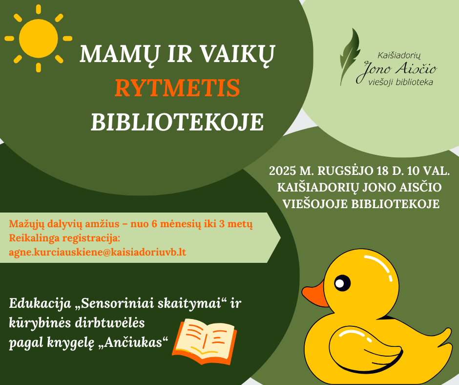 Edukacija „Sensoriniai skaitymai“ ir kūrybinės dirbtuvėlės pagal Ana Sojka knygelę „Ančiukas“. Sensorinių skaitymų metu vaikams suteikiama galimybė patirti pasakojimą ne tik klausantis, bet ir sužadinant kitus pojūčius, pasitelkiant sensorines priemones, žaidimus, muzikinius pratimus, įvairias užduotis. Edukacijos tikslas – įtraukiant vaikus į istoriją turtinti jų žodyną, vaizduotę, kūrybingumą. Istorijos įtvirtinimas – kūrybinių dirbtuvėlių metu pagamintas pupų maišelis – personažas Ančiukas.