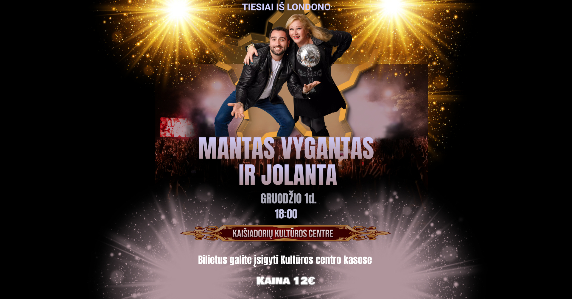 Pasiilgusiems pop dainų, geros nuotaikos, šilto, nuoširdaus bendravimo – Mantas Vygantas ir Jolanta visa tai atveš tiesiai iš Anglijos į Kaišiadorių kultūros centro sceną! Sekate juos socialiniuose tinkluose, esate girdėję pasakojimus apie asmeninį gyvenimą, bet niekada nematėte ir negirdėjote gyvai: dabar tai puiki galimybė!