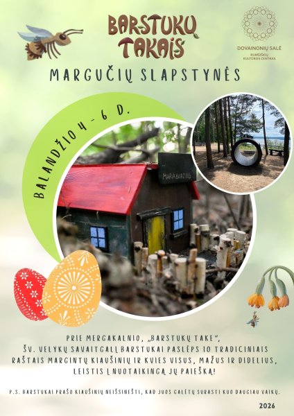 Šiemet smagias margučių slapstynes organizuoja paslaptingieji Dovainonių miško gyventojai – Barstukai! Prie Mergakalnio, „Barstukų take“, jie Šv. Velykų savaitgalį paslėps net 10 tradiciniais raštais margintų kiaušinių ir kvies visus leistis į nuotaikingą jų paiešką.
