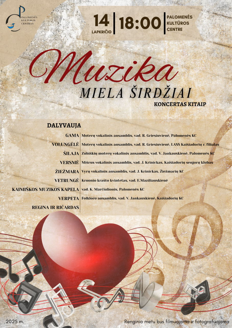 Koncerte kitaip skambės įvairių kolektyvų atliekami kūriniai, kupini šilumos ir bendrystės. Dalyvaus vokaliniai ansambliai „Gama“, „Volungėlė“, „Šilaja“, „Versmė“, „Žiežmara“, Kruonio krašto kvintetas „Vetrungė“, Palomenės kultūros centro kaimiškos muzikos kapela, folkloro ansamblis „Verpeta“ bei duetas Regina ir Ričardas.