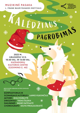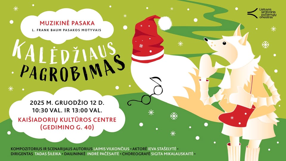 Šis muzikinė pasaka – puikus būdas pradėti šventinį laukimą, pasineriant į nuotykių kupiną istoriją, sukurtą pagal L. Frank Baum pasakos motyvus. Ją, kartu su orkestru, pasakos Baltoji Lapė (aktorė Ieva Stašelytė), mačiusi kaip Kalėdų naktį buvo pagrobtas ir išgelbėtas visų laukiamas Kalėdžius. Leiskite sau patikėti Kalėdų magija iš naujo, stebėdami, kaip Kalėdžius nugalės piktąsias būtybes ir sugrąžins džiaugsmą į visus namus. Nuotaikinga muzika ir išraiškinga vaidyba garantuoja, kad šventinė nuotaika aplankys kiekvieną žiūrovą!