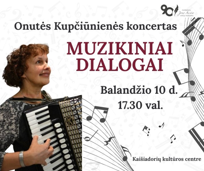 Kviečiame į Onutės Kupčiūnienės koncertą „Muzikiniai dialogai“. Tai muzikinė programa, kviečianti klausytojus į jautrų ir prasmingą dialogą per muziką.