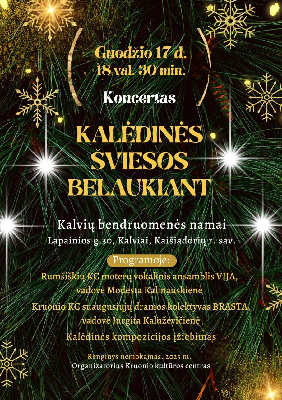 Programoje: Rumšiškių kultūros centro moterų vokalinis ansamblis „Vija“, vad. Modesta Kalinauskienė, Kruonio kultūros centro Kalvių suaugusiųjų dramos kolektyvas „Brasta“, vad. Jurgita Kaluževičienė, Kalėdinės kompozicijos įžiebimas.