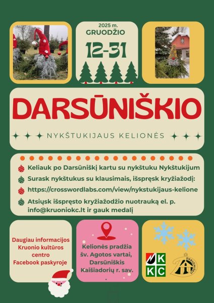 Kviečiame aplankyti nykštukais pasipuošusias Darsūniškio įžymias vietas tuo pat metu spręsti kryžiažodį . Kelionės pradžia (pirmas nykštukas laikantis kryžiažodžio klausimą) prie šv. Agotos vart (pirmųjų vartų atvažiuojant nuo Kruonio).