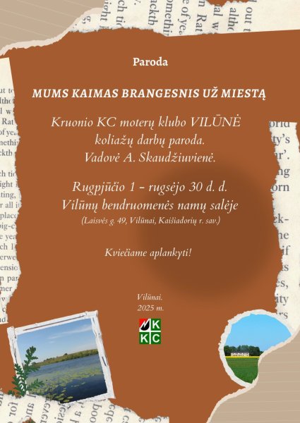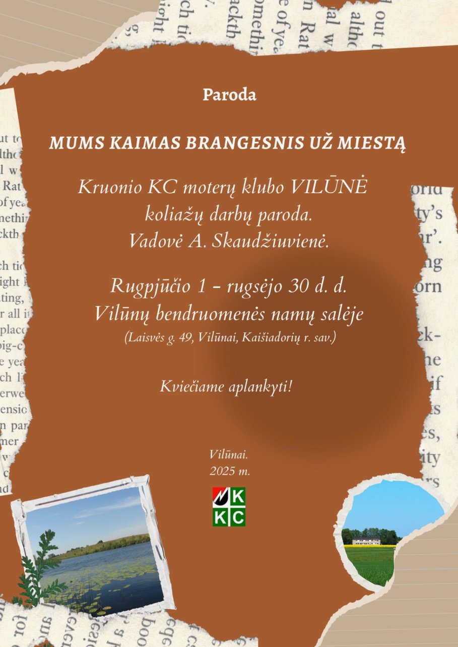 Parodoje eksponuojami Kruonio kultūros centro moterų klubo „Vilūnė" koliažo technika sukurti Vilūnų seniūnaitijos gamtos, architektūros ir istorinės vertės objektų paveikslai.