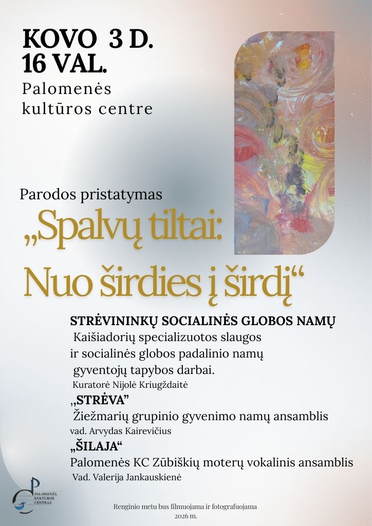 Palomenės kultūros centras kviečia į parodos „Spalvų tiltai: nuo širdies į širdį“ pristatymą. Renginio metu bus eksponuojami Strėvininkų socialinės globos namų Kaišiadorių specializuotos slaugos ir socialinės globos padalinio namų gyventojų tapybos darbai. Parodos kuratorė Nijolė Kriugždaitė pristatys ekspoziciją ir pasidalins įžvalgomis apie kūrybinį procesą. Meninę programą atliks Žiežmarių grupinio gyvenimo namų ansamblis „Strėva“ (vadovas Arvydas Kairevičius) ir Palomenės kultūros centro Zūbiškių moterų vokalinis ansamblis „Šilaja“ (vadovė Valerija Jankauskienė).