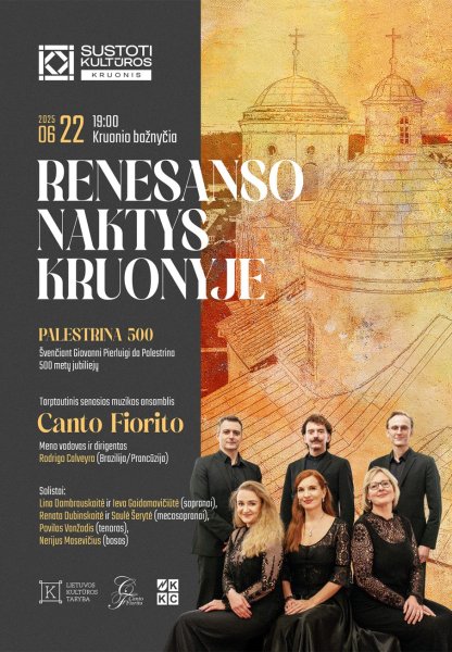 2025 m. birželio 22 d., sekmadienį, 19 val. Kruonio bažnyčioje (Darsūniškio g. 1A, Kruonis, Kaišiadorių r.) vyks ypatingas senosios muzikos vakaras – „RENESANSO NAKTYS KRUONYJE: PALESTRINA 500“, skirtas vieno žymiausių Vakarų muzikos istorijos kūrėjų Giovanni Pierluigi da Palestrinos 500-osioms gimimo metinėms.