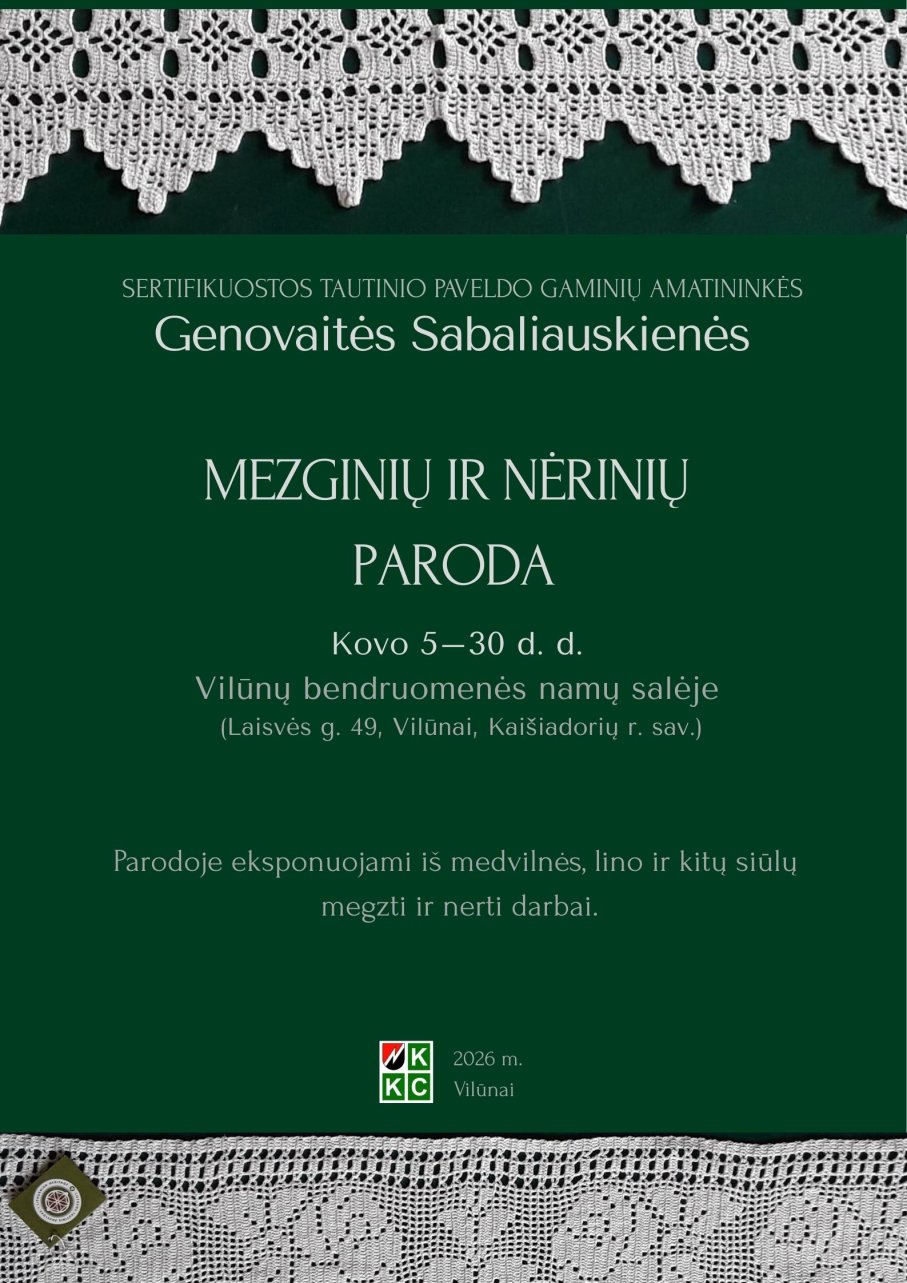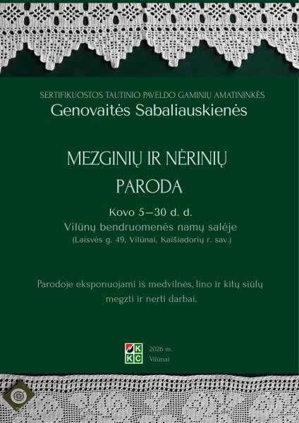 Parodoje eksponuojami iš baltų medvilninių siūlų nerti galai rankšluosčiams, prijuostėms, pagalvių užvalkalams, taip pat servetėlės ir staltiesėlės. Megztos virbalais kojinės, riešinės ir pirštinės. Amatininkė Genovaitė Sabaliauskienė – sertifikuota tautinio paveldo produktų kūrėja.