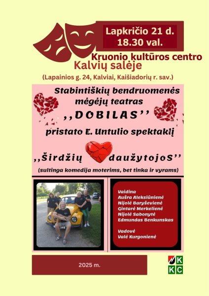 Stabintiškių bendruomenės mėgėjų teatro „Dobilas“, vad.  Valė Kurgonienė, spektaklis apie meilės paieškas, santykių vingius ir širdies  paslaptis.