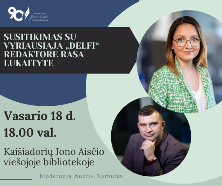 Vasario 18 d., 18.00 val. Kaišiadorių Jono Aisčio viešoji biblioteka kviečia visus, besidominčius žiniasklaida, visuomenės aktualijomis ir prasmingu dialogu į susitikimą su „Delfi“ vyr. redaktore Rasa Lukaityte. Renginio metu bus aptariamos žiniasklaidos aktualijos, informacijos patikimumo svarba, žurnalistikos vaidmuo šiuolaikinėje visuomenėje bei kiti aktualūs klausimai. Tai puiki proga išgirsti redaktorės įžvalgas ir užduoti jai rūpimus klausimus. Susitikimą moderuos Audris Narbutas.