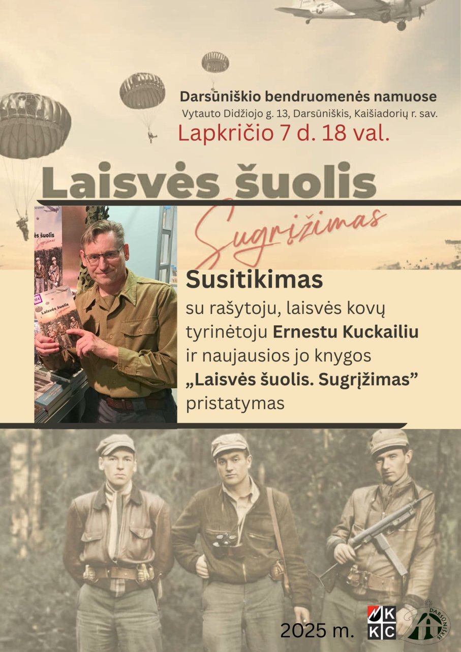 Susitikimas su rašytoju, laisvės kovų tyrinėtoju Ernestu Kuckailiu ir naujausios jo knygos „Laisvės šuolis. Sugrįžimas“ pristatymas.