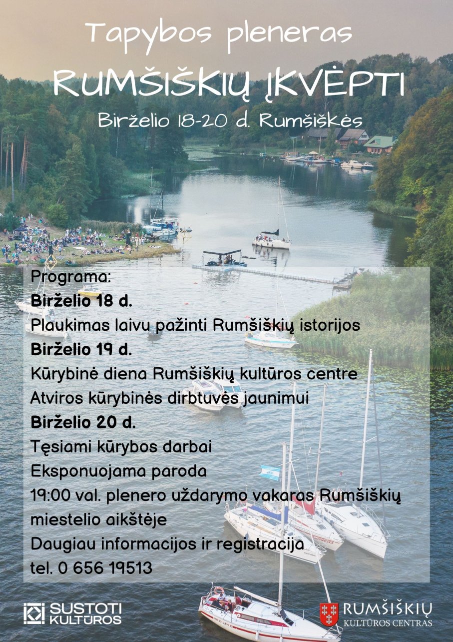 Rumšiškių kultūros centras kvečia tapytojus į plenerą „Rumšiškių įkvėpti”. Plenero metu plauksime laivu susipažinti su Rumšiškių istorija, pasakojimais dalinsis Žygimantas Stankevičius. Likusios dvi dienos bus skirtos kūrybai, ir per jas gims paveikslai, kurie vėliau bus eksponuojami Rumšiškių kultūros centre.