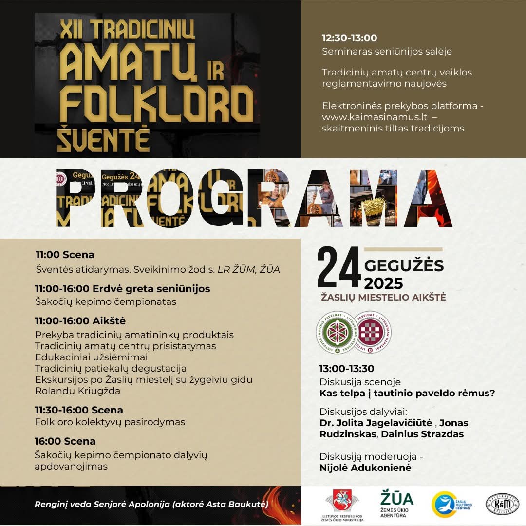 Gegužės 24-ąją Žasliuose susitiks praeities įkvėpta kūryba, žmonės ir pasakojimai. Tradiciniai amatai, folkloras, įkvepianti aplinka ir gyvas ryšys su praeitimi – visa tai laukia Jūsų Žasliuose.