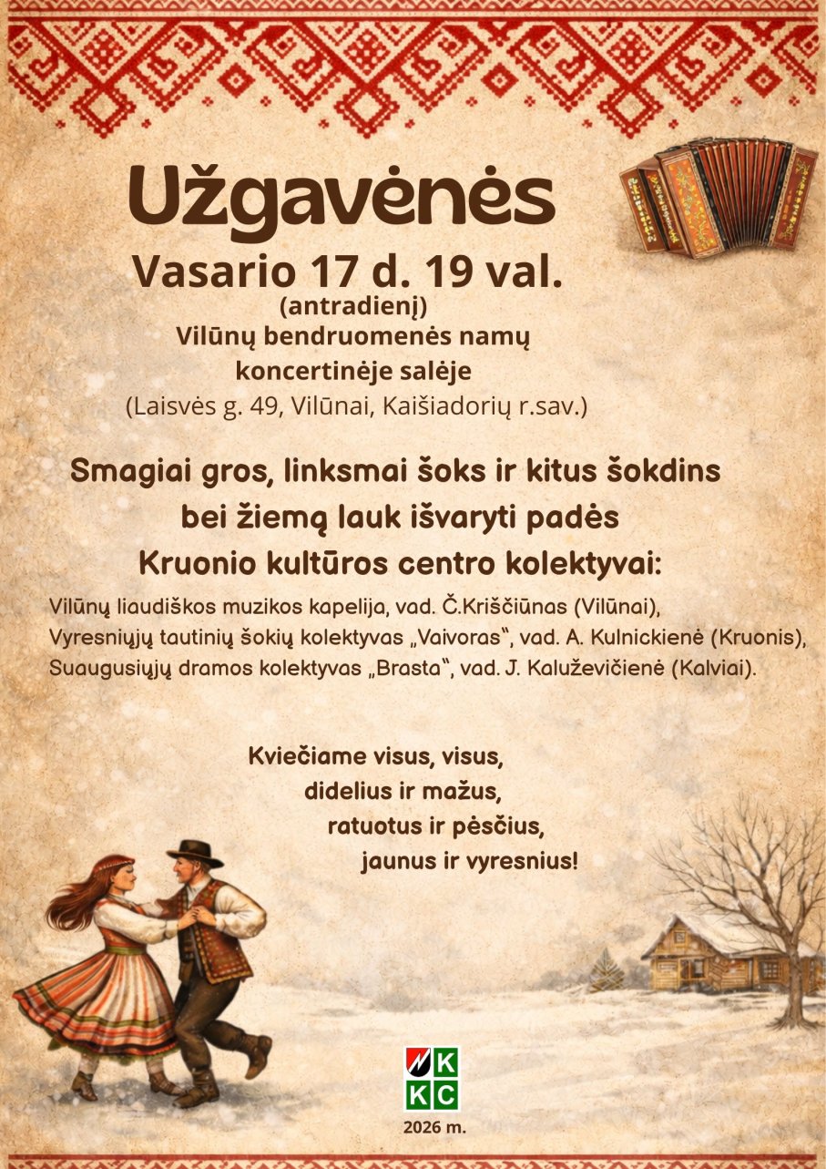 Užgavėnės – žiemos išvarymo šventė ir paskutinė mėsiedo diena. Vasario 17 d., 19 val. Vilūnuose vyks kanapinio ir lašininio kova, o žiemą lauk varys, kultūros centro meno kolektyvai. Programoje dalyvaus Kruonio kultūros centro kolektyvai: Suaugusiųjų tautinių šokių kolektyvas „Vaivoras“ (vad. A. Kulnickienė), suaugusiųjų dramos kolektyvas „Brasta“ (vad. J. Kaluževičienė) ir Vilūnų liaudiškos muzikos kapelija (vad. Č. Kriščiūnas).