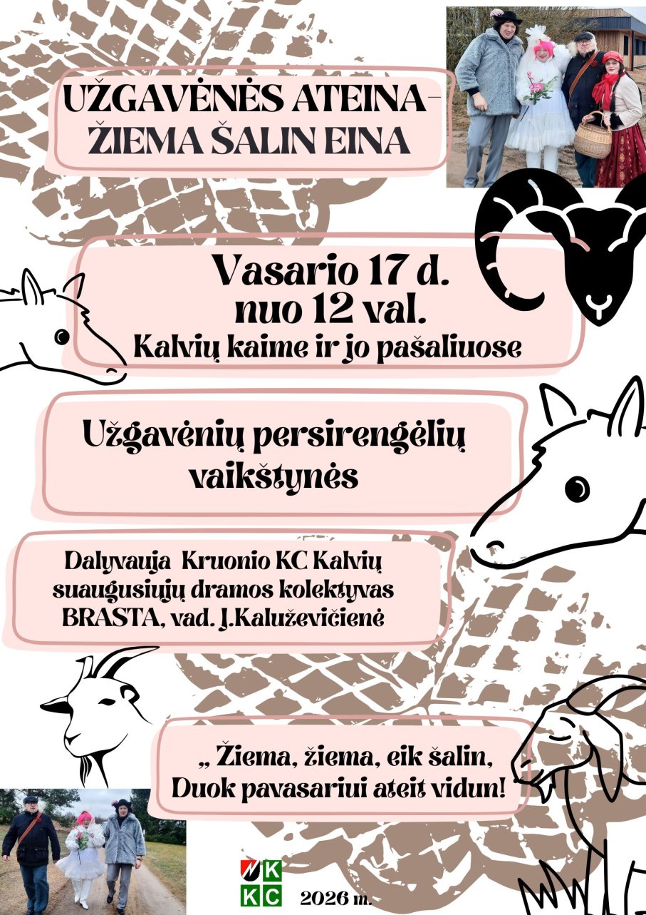 Tradicinės Užgavėnių persirengėlių vaikštynės skirtos puoselėti ir pristatyti Užgavėnių tradicijas bei papročius. Persirengėliai lankys gyventojus jų namuose, sveikins su Užgavėnėmis, linkėdami sveikatos, stiprybės, geros nuotaikos ir artėjančio pavasario džiaugsmo. Dalyvauja Kruonio KC Kalvių skyriaus suaugusiųjų dramos kolektyvas „Brasta“, vad. Jurgita Kaluževičienė.
