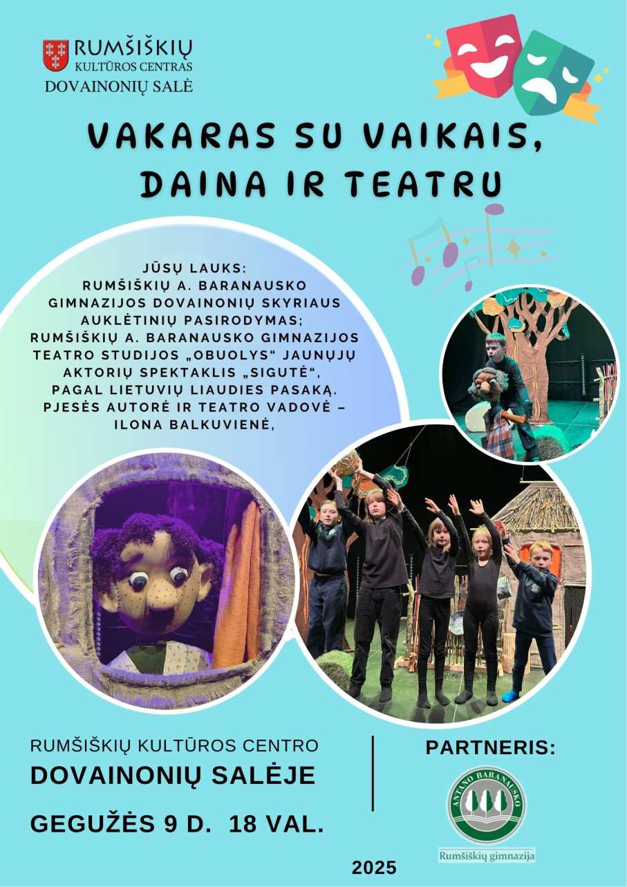 Kviečiame jaukiai praleisti vakarą su vaikais Dovainonių salėje. Jūsų lauks Rumšiškių A. Baranausko gimnazijos Dovainonių skyriaus auklėtinių pasirodymas (vad. Inga Bražionienė), taip pat kviesime pasižiūrėti Rumšiškių A. Baranausko gimnazijos teatro studijos „Obuolys“ jaunųjų aktorių spektaklio „Sigutė“ pagal Lietuvių liaudies pasaką. Pjesės autorė ir teatro vadovė – Ilona Balkuvienė, pjesėje vaidins net 15 jaunųjų artistų.